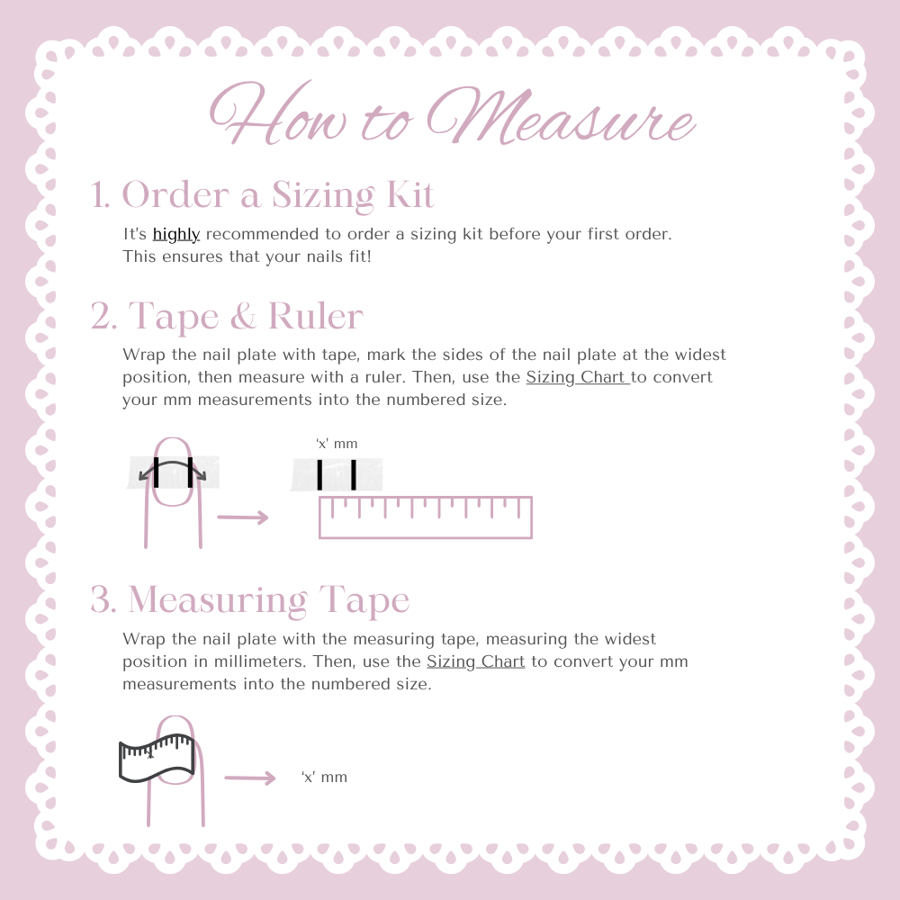 If you have different measurements, please choose the "Custom" option, and enter in the size numbers that coordinate with the millimeters you measured for each nail bed in the description box at checkout.
