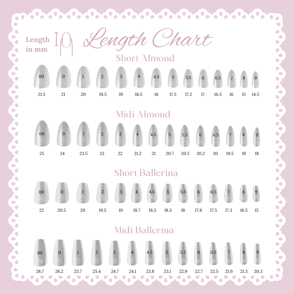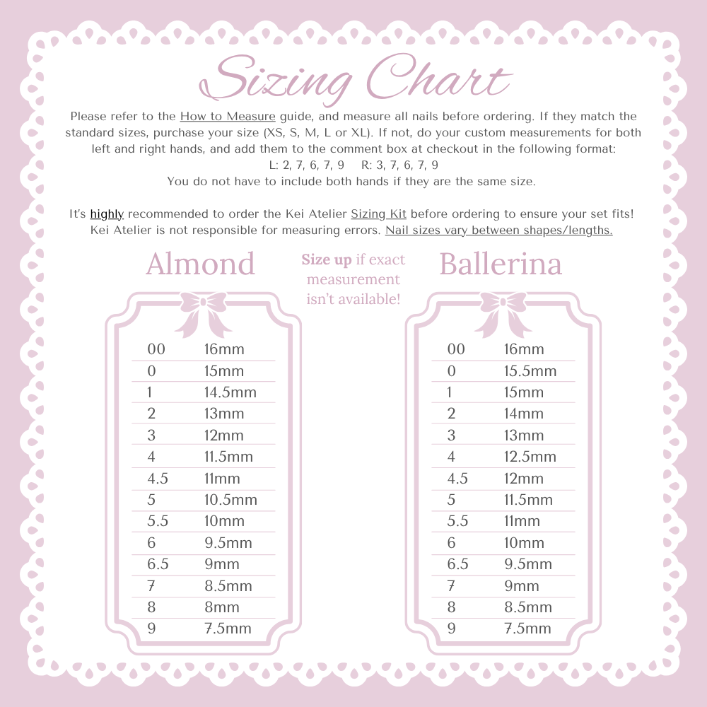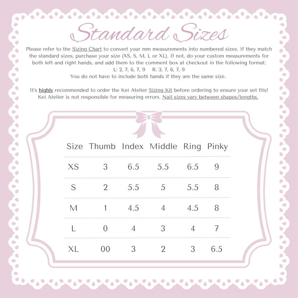 ♡ Please refer to the Standard Sizes chart and the Sizing Chart to determine your nail size and set. Choose the "Custom" option if you do not match any of the standard sizes. Then enter your numbers in the "order special instructions" text box at check out. See more details in the Sizing drop-down menu below.